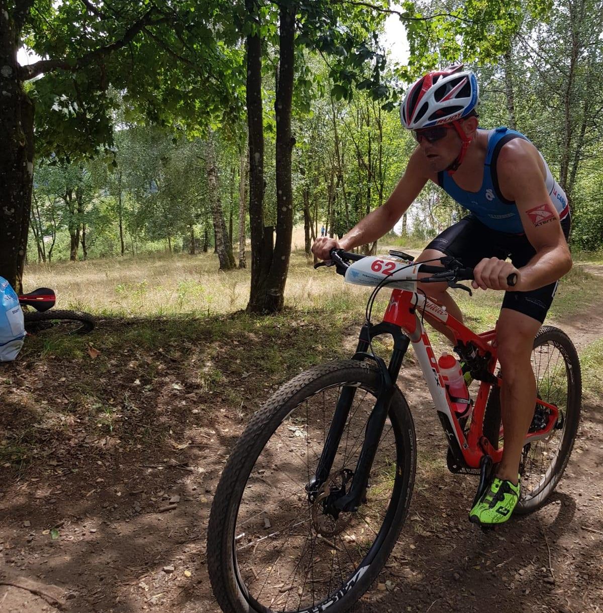 Matthias Seitz war für uns am Samstag in Schalkenmehren (Vulkan-Cross-Triathlon) bei der deutschen Meisterschaft am Start Es mussten 1,5km Schwimmen, 32km MTB und ein Crosslauf über 9km bewältigt werden. Nach dem Schwimmen lag er ca. auf Platz 20, das Radfahren war leider wenig technisch, führte aber mit 2-3 sehr steilen Passagen bergauf und bergab. Hier konnte er auf Platz 11 vorfahren. Das Laufen war mit 300hm sehr anspruchsvoll. Am Ende sprang für Matze Platz 15 overall (mit Profis) und der 2. Platz in der AK heraus. Damit hat sich der sehr lange Anfahrtsweg (430km) doch gelohnt.