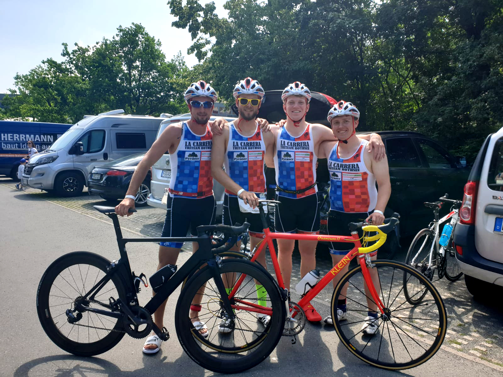 Während die meisten La Carreras am Sonntag beim Rothseetriathlon starteten, ging unser Landesliga Team in Forchheim an den Start, wo nach der Premiere 2018 auch heuer ein zweigeteilter Mannschaftswettkampf ausgetragen wurde. Geschwommen wurden vormittags zunächst 600m im Freibad und direkt anschließend 2,5 km gelaufen. Mittags standen dann 20 km Radfahren und erneut 2,5 km Laufen auf dem Programm, wobei beim Radfahren Windschattenfahren innerhalb des eigenen Teams erlaubt war. Der Zieleinlauf des dritten Starters war dann entscheidend für die Platzierung des Teams. Nach dem ersten Wettkampfteil lagen unsere Jungs noch auf Rang 6, mussten dann beim zweiten Teil allerdings einige Teams ziehen lassen, sodass es am Ende nur für Platz 11 reichte. Im Einsatz waren Florian Macher, Frank Weber, Jan Rupprecht und Till Manthey.
